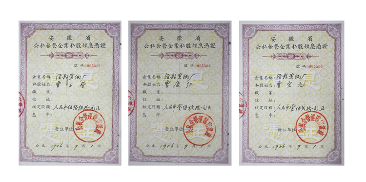 ??1954年2月18日,涇縣小嶺村成立“公私合營涇縣宣紙廠”籌備處,開始清理財產(chǎn)。20日召開了私股董事會,會議認(rèn)為曹康齡對聯(lián)營無投資不具有代表性,推選為私股代表不妥。遂改推選曹子榮為私股代表,建立了私股籌備合營委員會,委員由曹世定、曹元忠、曹康沅、曹松壽、曹康齡、曹俊臣、曹良志等7人組成,確定當(dāng)天為財產(chǎn)清理交接日。21日,召開了公私合營涇縣宣紙廠籌委會,私方代表全部出席會議,討論了財務(wù)、政務(wù)交接事宜,成立了由公方、私方共同組成的行政組和財務(wù)組。28日,聯(lián)營董事會又推舉曹子榮為私方代表在“合營”協(xié)議書上簽字。3月2日正式簽署了《公私合營涇縣宣紙廠協(xié)議書》,議定主要事項:公方投資3.5億元,私方投資1.144億元(聯(lián)營處的固定資產(chǎn)、原料、成品等折價,不含流動資金64.89萬元),下設(shè)3個生產(chǎn)部,公方確定正廠長一名,為行政領(lǐng)導(dǎo);私方推舉曹康齡任副廠長,負(fù)責(zé)生產(chǎn)。3月16日,涇縣人民政府派陳建華為公方代表就任宣紙廠歷史上第一任廠長。陳建華到任后,縣政府先后于3月、4月、10月派來3人分別任工務(wù)股、會計、生產(chǎn)等部門負(fù)責(zé)人。自此,“公私合營涇縣宣紙廠”開始了正常的生產(chǎn)、經(jīng)營、管理工作。
