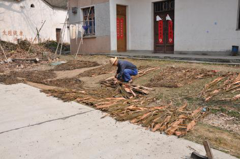 蒸煮青檀枝條的方法有豎蒸和橫蒸兩種。將各小捆并成大捆,豎立鍋內(nèi),注入清水后燒火蒸煮。