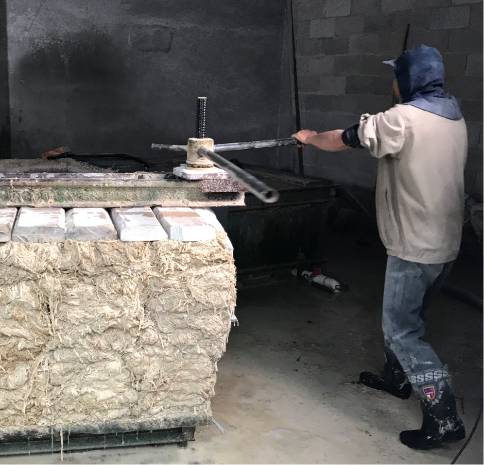 將鞭草、洗草合并后形成的散燎草均勻鋪放在木榨上,鋪放成四邊周整的草垛,蓋上榨板,將其榨干。