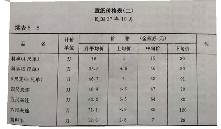圖 戰(zhàn)爭(zhēng)年代極不穩(wěn)定的宣紙價(jià)格(《涇縣志》1996版259頁(yè))