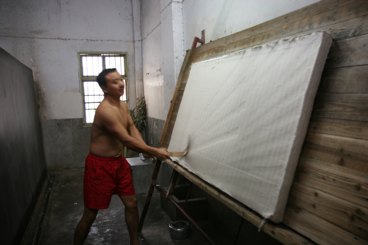 烘帖也稱炕帖,烘帖一般有三種方式,一是曬紙工下班后,利用焙的余溫,額上梢下將濕帖靠在紙焙旁;二是曬紙工上班時,將焙頭打掃干凈,將紙?zhí)茉诒侯^;三是如前兩種方式不能將紙?zhí)娓?,就架火烤干?/span>