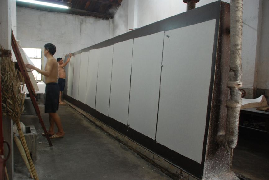 宣紙傳統(tǒng)干燥方法是用耐火磚砌爐子,與操作間隔墻。操作間(又稱:焙屋、焙籠)內(nèi)用特制大磚砌一道中空墻,被稱為“焙”,焙內(nèi)設(shè)有煙火道,便于提溫均勻。操作時,以燃料將爐子點(diǎn)燃,爐中高溫通過煙火道進(jìn)入焙墻,將濕宣紙以松毛刷刷在提溫后的焙上烘干。缺陷是火墻每隔一段時間就要重建一次。