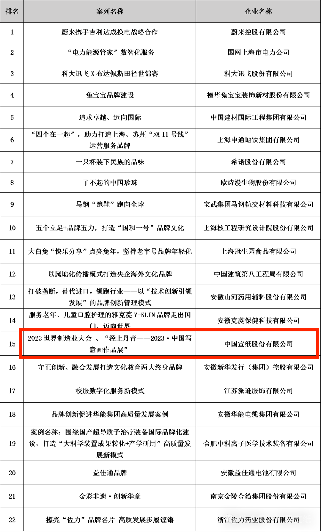 5月8日,在第八個中國品牌日到來之際,首批長三角國際品牌創(chuàng)新案例由長三角一市三省專業(yè)機構(gòu)在上海第一次聯(lián)袂發(fā)布。中國宣紙股份有限公司“2023世界制造業(yè)大會”“涇上丹青——2023?中國寫意畫作品展”案例榜上有名!