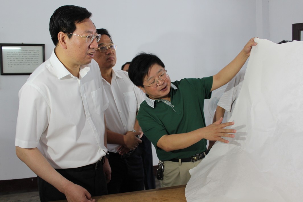 在參觀過(guò)程中,曹部長(zhǎng)詳細(xì)了解了宣紙的傳統(tǒng)制作過(guò)程以及獨(dú)特的原材料,并親自體驗(yàn)制作宣紙。胡文軍董事長(zhǎng)向就公司目前的發(fā)展?fàn)顩r以及下一步發(fā)展目標(biāo)曹部長(zhǎng)做了詳細(xì)匯報(bào)。曹部長(zhǎng)充分肯定了集團(tuán)公司近年來(lái)所取得的發(fā)展成績(jī),并指出,宣紙的傳統(tǒng)制作工藝,是人類(lèi)非物質(zhì)文化遺產(chǎn),是全世界人民共同的精神財(cái)富,宣紙集團(tuán)要充分發(fā)揮文房四寶行業(yè)龍頭作用,要在保證宣紙質(zhì)量的前提下著力提升產(chǎn)量,將傳統(tǒng)的宣紙生產(chǎn)與文化旅游相結(jié)合,積極促進(jìn)產(chǎn)業(yè)轉(zhuǎn)型,實(shí)現(xiàn)產(chǎn)業(yè)化、集團(tuán)化發(fā)展,為傳承宣紙技藝、弘揚(yáng)中華文化作更多更大貢獻(xiàn)。