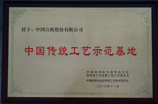 2016年11月8日第二屆中國傳統(tǒng)工藝標準化論壇在江蘇揚州舉行,會上宣布了全國5家中國傳統(tǒng)工藝示范基地獲選單位,中國宣紙股份有限公司名列其中,也是安徽省唯一一家入選單位。