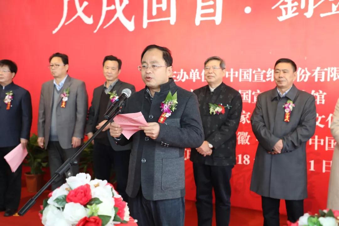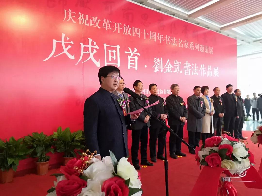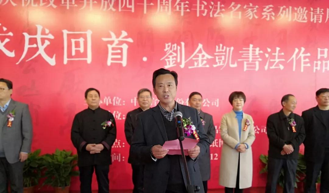 ??開幕式由中國宣紙股份有限公司董事長胡文軍主持,他首先介紹了參加開幕式的領導和嘉賓。他表示,“襟懷紙上、文質書心”,宣紙是涇縣人民為世界文化的奉獻,丹青妙筆與宣紙的結合,構成一幅幅完美的作品?!案灿趥鹘y(tǒng),為時代放歌”,這既是宣紙傳承發(fā)展的寫照,也是劉金凱先生的藝術追求。今天我們身處文化自信的新時代,又迎來改革開放四十周年,迎來了中國宣紙博物館年度書法盛事——“戊戌回首˙劉金凱書法作品展”,恰逢其時。