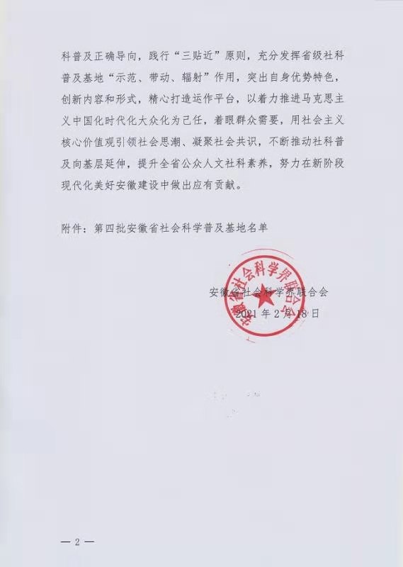 文件要求,入選單位要堅(jiān)持以習(xí)近平新時(shí)代中國特色社會(huì)主義思想為指導(dǎo),深入學(xué)習(xí)貫徹黨的十九大和十九屆二中、三中、四中、五中全會(huì)精神,嚴(yán)格按照《安徽省社會(huì)科學(xué)知識(shí)普及基地設(shè)立與管理辦法》有關(guān)規(guī)定,堅(jiān)持社科普及正確導(dǎo)向,踐行“三貼近”原則,充分發(fā)揮省級(jí)社科普及基地“示范、帶動(dòng)、輻射”作用,突出自身優(yōu)勢(shì)特色,創(chuàng)新內(nèi)容和形式,精心打造運(yùn)作平臺(tái),以著力推進(jìn)馬克思主義中國化時(shí)代化大眾化為己任,著眼群眾需要,用社會(huì)主義核心價(jià)值觀引領(lǐng)社會(huì)思潮、凝聚社會(huì)共識(shí),不斷推動(dòng)社科普及向基層延伸,提升全省公眾人文社科素養(yǎng),努力在新階段現(xiàn)代化美好安徽建設(shè)中做出應(yīng)有貢獻(xiàn)。