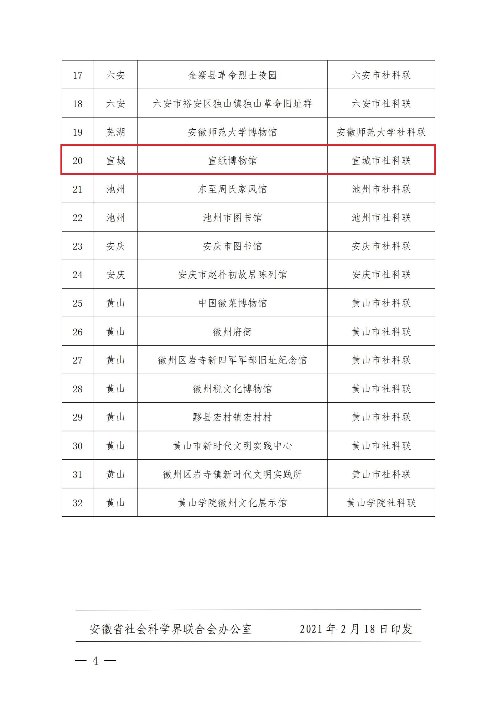 近日,安徽省社會(huì)科學(xué)界聯(lián)合會(huì)公布了第四批安徽省社會(huì)科學(xué)普及基地名單,宣紙博物館等32家單位入選。
