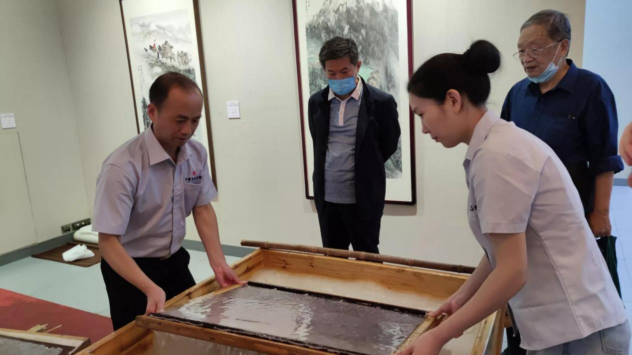 在展覽現(xiàn)場,“大國工匠”、撈紙工周東紅,與非遺傳承人曹紅霞向參觀的書畫家們展示了宣紙制作技藝?!皞鹘y(tǒng)宣紙制作工藝有108道,全部是手工完成?!敝軚|紅向藝術(shù)家們講解道。