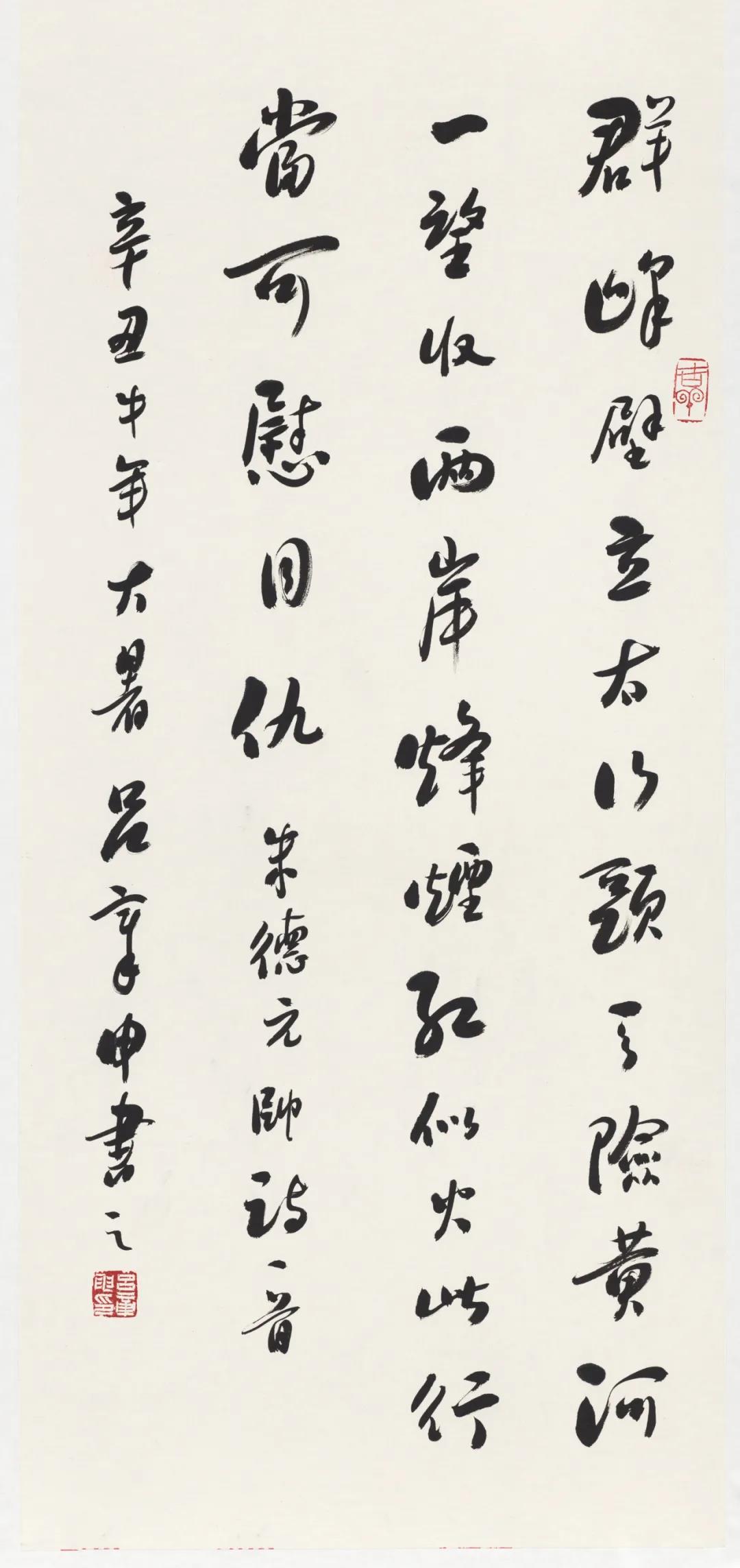 呂章申 朱德元帥詩(shī)一首100×50厘米釋文:群峰壁立太行頭,天險(xiǎn)黃河一望收。兩岸烽煙紅似火,此行當(dāng)可慰同仇。創(chuàng)作年代:2021年