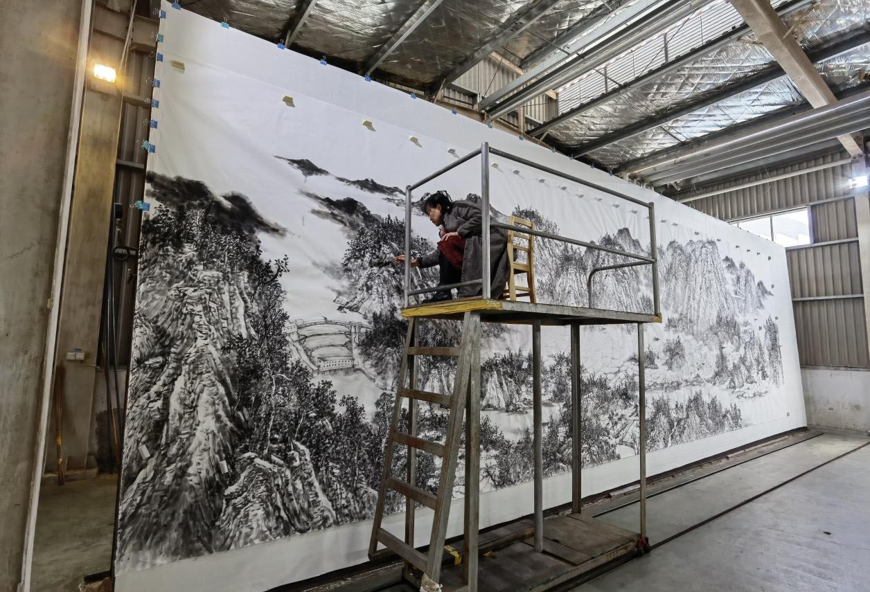 據(jù)悉,湯鳳云老師目前任蕪湖市中山畫院執(zhí)行院長、北京三明堂國展創(chuàng)作班導(dǎo)師。《涇川勝境圖》創(chuàng)作歷時半月,全程在三丈三宣紙曬紙車間創(chuàng)作完成。她說:“宣紙是涇縣的,一張張潔白的宣紙歷經(jīng)千錘百煉,才能做到百折無損、紙壽千年,蘊藏著涇縣勞動人民創(chuàng)造的、千百年來傳承的工匠精神、廉潔文化,我身為涇縣人,看到三丈三感到十分震撼。我在作品中畫入了縣城、宣紙博物館、水西勝景、陳村水庫、桃花潭、查濟、云嶺、黃田、桃?guī)X六道灣等著名景觀,讓家鄉(xiāng)優(yōu)美的自然風光和悠久的人文歷史在宣紙上得以充分展現(xiàn)”。
