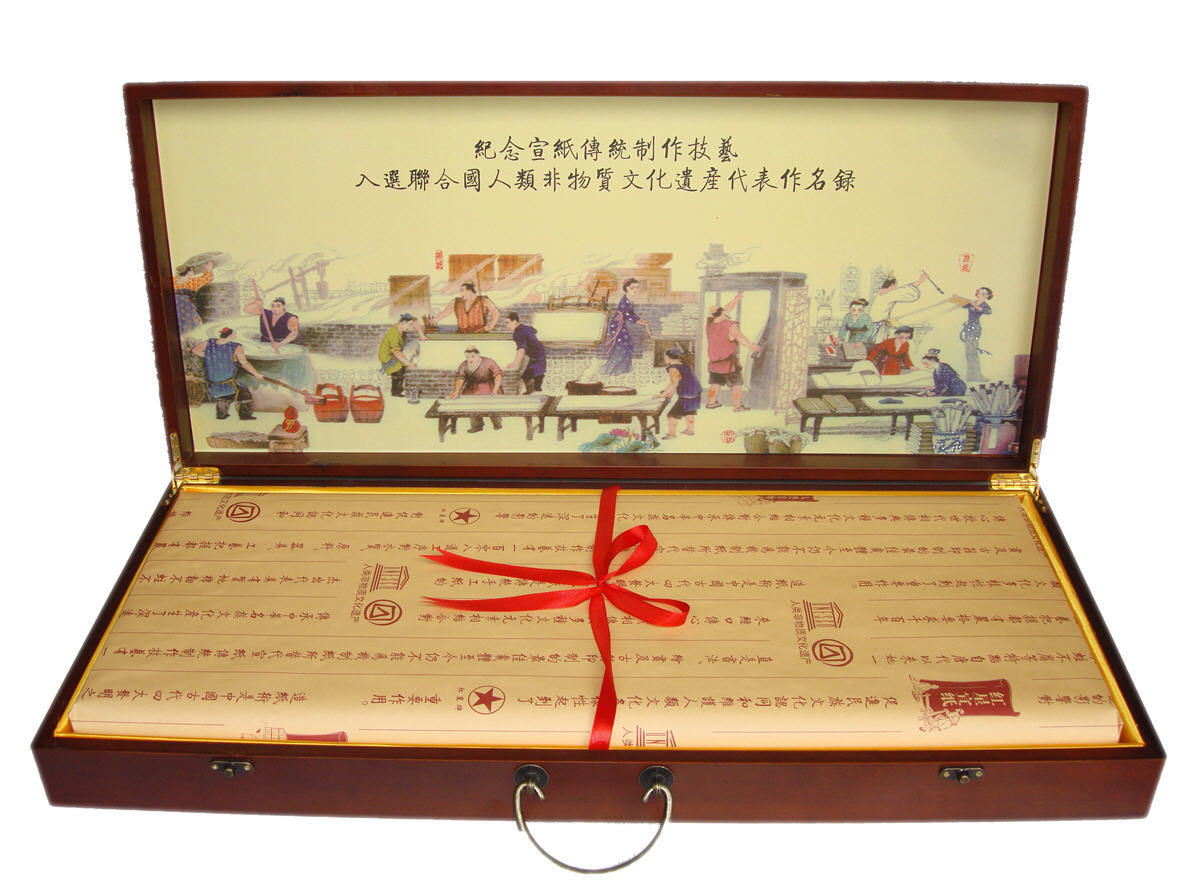中華造紙術(shù)是中國古代四大發(fā)明之一,宣紙傳統(tǒng)制作技藝始于唐代,產(chǎn)于涇縣,因地得名,迄今已傳承一千多年,是中華造紙術(shù)的最典型代表,堪稱存世的活化石,被歷代譽為“紙壽千年、墨韻萬變”而1中外。2009年9月30日,“宣紙傳統(tǒng)制作技藝”被聯(lián)合國教科文組織批準(zhǔn)為“人類非物質(zhì)文化遺產(chǎn)代表作名錄”,2010年8月19日,國家文化部在北京人民大會堂隆重舉行中國入選聯(lián)合國教科文組織非物質(zhì)文化遺產(chǎn)名錄項目頒證儀式。中國宣紙集團公司為紀(jì)念宣紙制作技藝成功入選人類非遺,精選青檀樹枝的韌皮和沙田長桿稻草,采用“紅星”牌宣紙生產(chǎn)特有的山澗流動溪水,全手工精制抄造,于國慶六十一周年之際向國內(nèi)外文化藝術(shù)市場推出“人類非遺”特種紅星牌紀(jì)念宣紙。