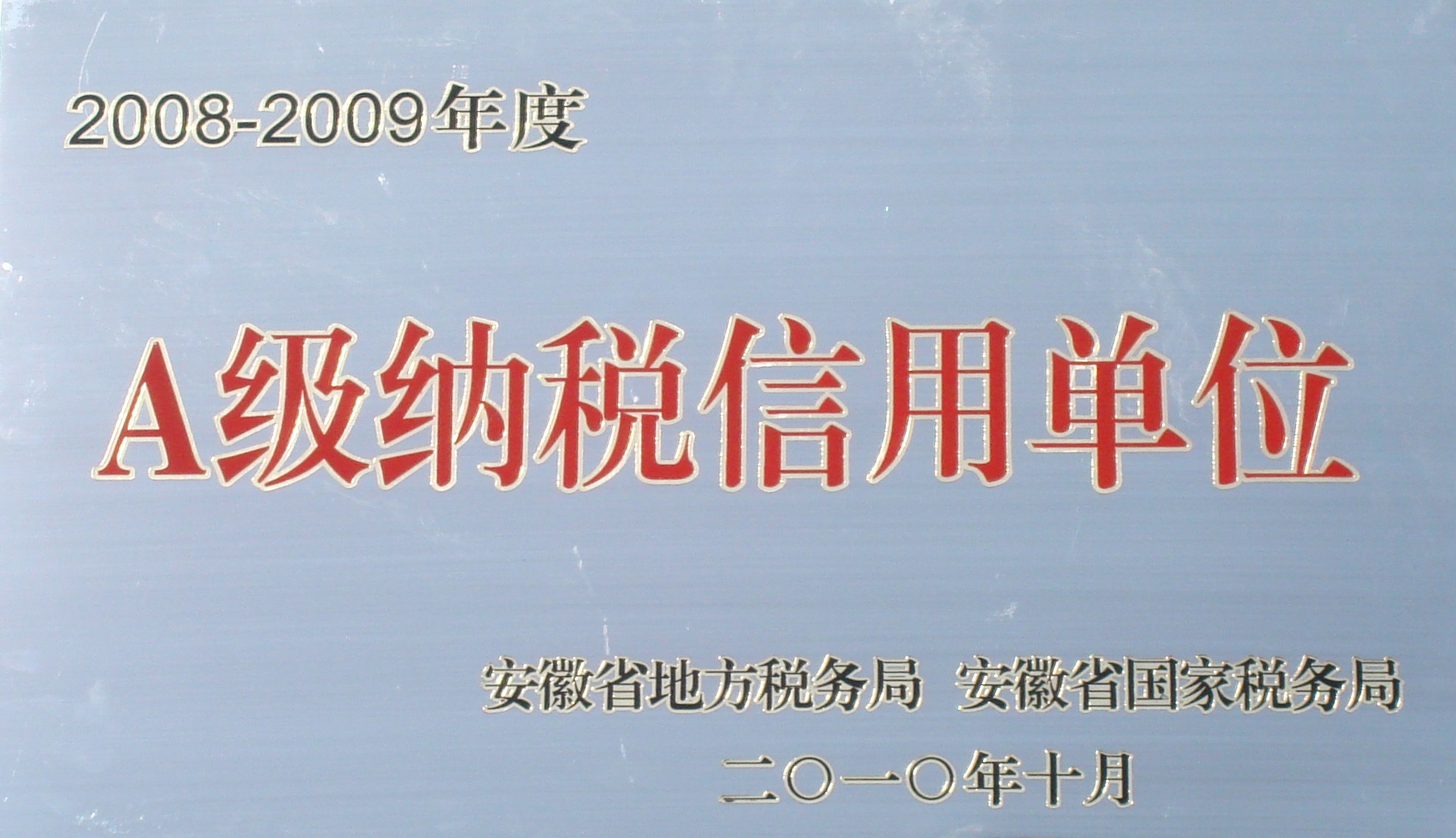 公司榮獲“安徽省2008-2009年度A級(jí)納稅信用單位”稱號(hào)