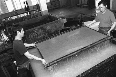 圖為宣紙集團公司的工作人員在“撈紙”。