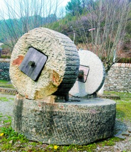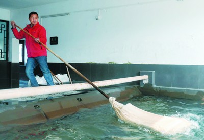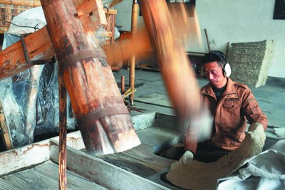 青檀皮等原料在千斤碾中碾碎。
