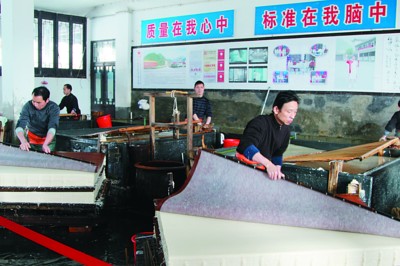 涇縣宣紙在上世紀(jì)50年代全縣只有四個槽,工人師傅們生產(chǎn)生活條件艱苦。上世紀(jì)50年代中葉,安徽省工藝美術(shù)大師、省勞動模范周乃空從部隊轉(zhuǎn)業(yè)分配到?jīng)芸h宣紙廠,分管生產(chǎn),他拜工人為師,利用開座談會的形式,把工人的發(fā)言記錄下來,整理出第一本宣紙生產(chǎn)操作規(guī)程。隨著宣紙生產(chǎn)規(guī)模的日益擴大,宣紙對外影響也日益彰顯。 1995年,涇縣被首批百家中國特產(chǎn)之鄉(xiāng)命名暨宣傳活動組委會命名為“中國宣紙之鄉(xiāng)”。 2002年,涇縣被國家批準(zhǔn)為宣紙原產(chǎn)地域。 1992年,涇縣宣紙工業(yè)局、中國宣紙公司、涇縣宣紙廠合并,組建“中國宣紙集團公司”,2012年12月成功完成股份制改造,整體改制成立中國宣紙股份有限公司。 2013年,該公司宣紙產(chǎn)量首次突破700噸,同比增長4.5%,實現(xiàn)銷售收入22393萬元,增長17.7%,實現(xiàn)利稅10449萬元,增長18.7%,經(jīng)營效益大幅提升,生產(chǎn)經(jīng)營呈現(xiàn)出平穩(wěn)快速發(fā)展的良好勢頭?!?/p>