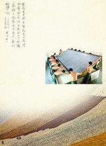 用紙簾手工撈紙,一般兩人合作,蕩勻揚起,全靠手感細(xì)膩功夫。