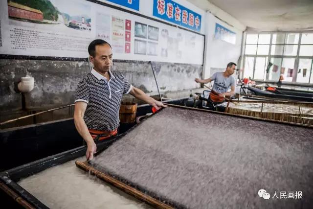 舅舅帶著他參觀了宣紙廠各個生產(chǎn)工序的車間。當(dāng)來到撈紙車間的時候,這個年輕人被吸引住了,只見在一個混有紙漿的水槽兩端站著兩位撈紙的師傅,他們一人抬著一張竹簾的一端,在紙槽中左蕩一下右蕩一下,一張紙就撈了出來,前后時間不過十幾秒。“工作間很涼快,而且工藝很簡單,就兩下,就做出來了一張紙,當(dāng)時我說我就做這個工作。”周東紅回憶起自己當(dāng)年稚嫩的想法,嘴角露出了微笑。他自此開始了撈紙的生涯。