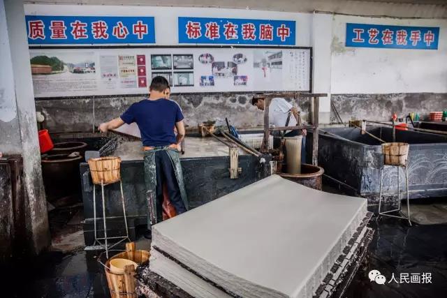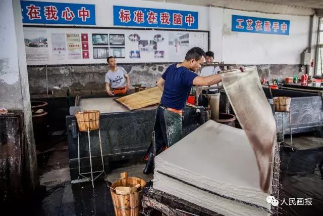 “做這一門技術(shù),難就難在厚的、薄的、大的、小的宣紙你都要能做?!币簿褪钦f,只是撈均勻了還不能算是成品,還要把握好分量,宣紙品種很多,每種在分量上都有規(guī)定,每張宣紙重量上的誤差都不能超過1克。此外,剛在紙槽里加進(jìn)去紙漿的時候濃度比較高,每撈一張都會稀一點,濃度越來越低,如何做到濃度高和濃度低的時候厚薄一樣呢?靠的全是兩個人的配合和手感。撈出來的紙在疊放的時候,也不能有起泡、滴水洞等毛病。