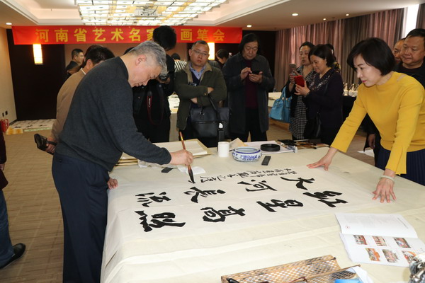 下午,參加新聞發(fā)布會的所有藝術家在河南省軍隊離退休干部服務中心四樓會議室,舉行了大型書畫筆會。鄭州市文聯主席鐘海濤先生,中原文化藝術學院美術系副主任張熙先生等參加筆會活動。
