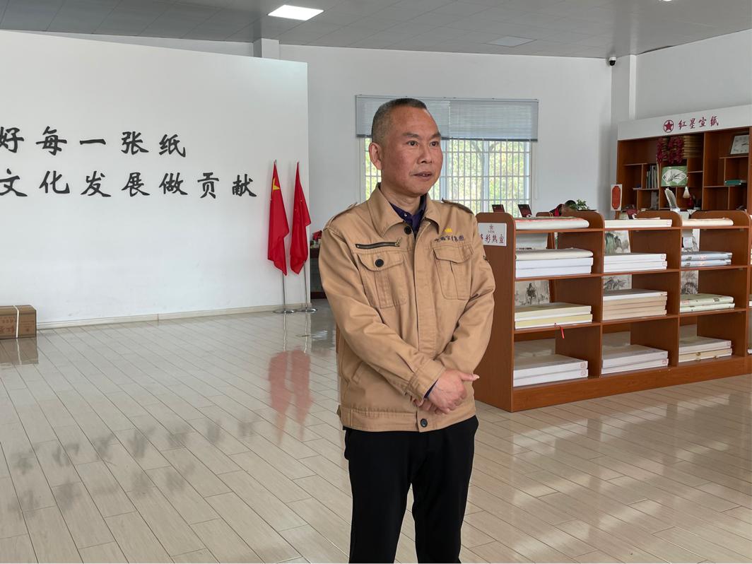 ??中國(guó)宣紙股份有限公司副總經(jīng)理黃迎福接受媒體采訪。(未來(lái)網(wǎng)記者凌萌 攝)